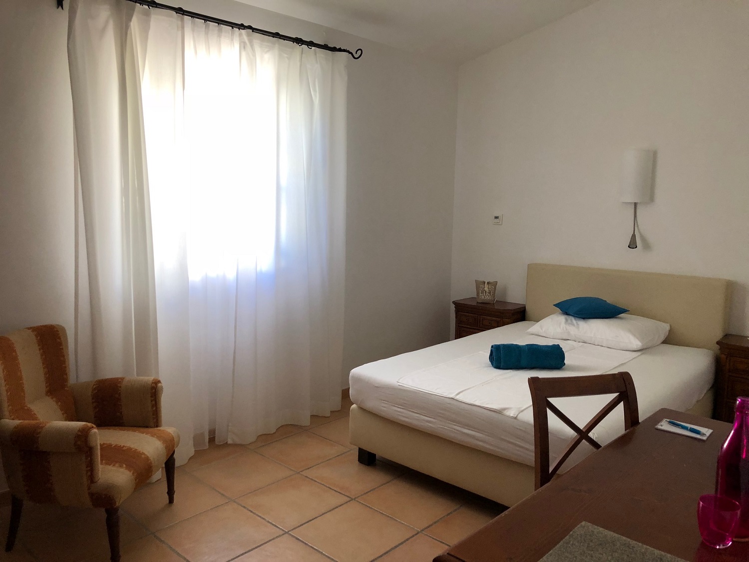The single rooms (13-16 sqm) are equipped with a king size bed and private bathroom and toilet. You have a view of the inner courtyard or the garden.